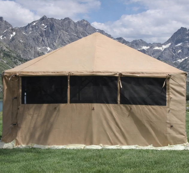 Namiot został wykonany z wytrzymałego materiału PVC ze wzmocnieniem winylowym oraz oparty na stabilnym stelażu. Brak elementów pneumatycznych eliminuje ryzyko uszkodzeń i zapewnia długą żywotność produktu.